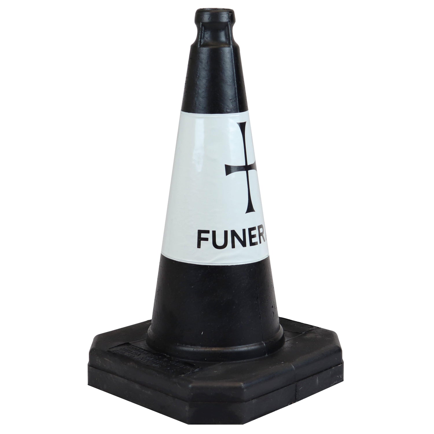 The PVC funeral cones are equipped with a high quality bright white sleeve with the “FUNERAL” text and cross icon.