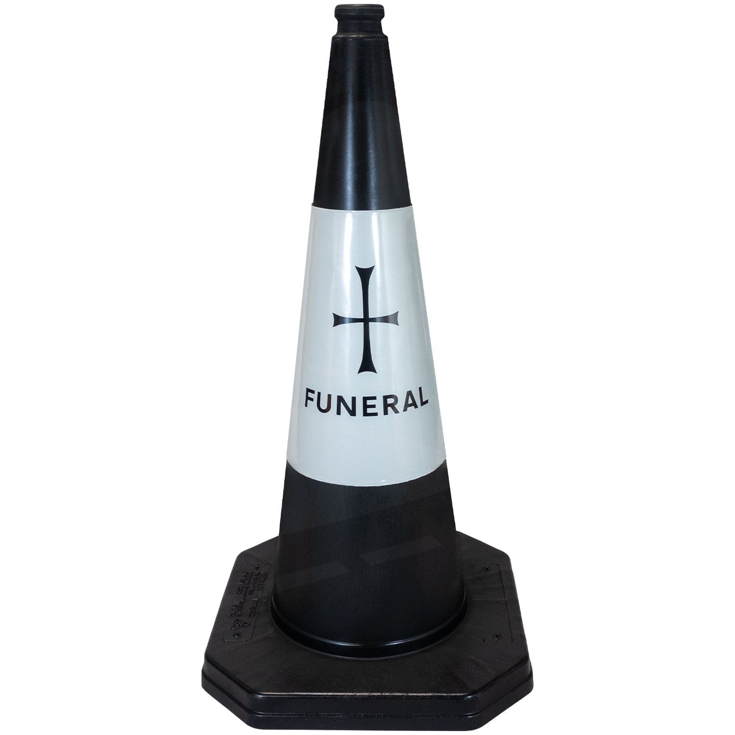 The PVC funeral cones are equipped with a high quality bright white sleeve with the “FUNERAL” text and cross icon.